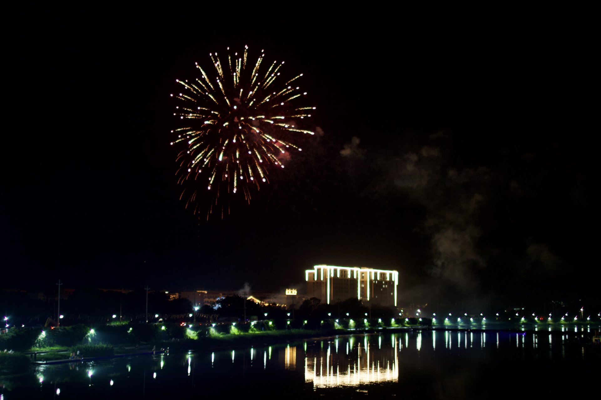 在一个夏天的晚上,我带着两个小朋友去拍夜景,虽然是1.4光圈,但夜间表现总是不尽人意。这时候远处传来低沉的烟花声音,于是调慢了快门,等待烟花绽放的那一瞬间。